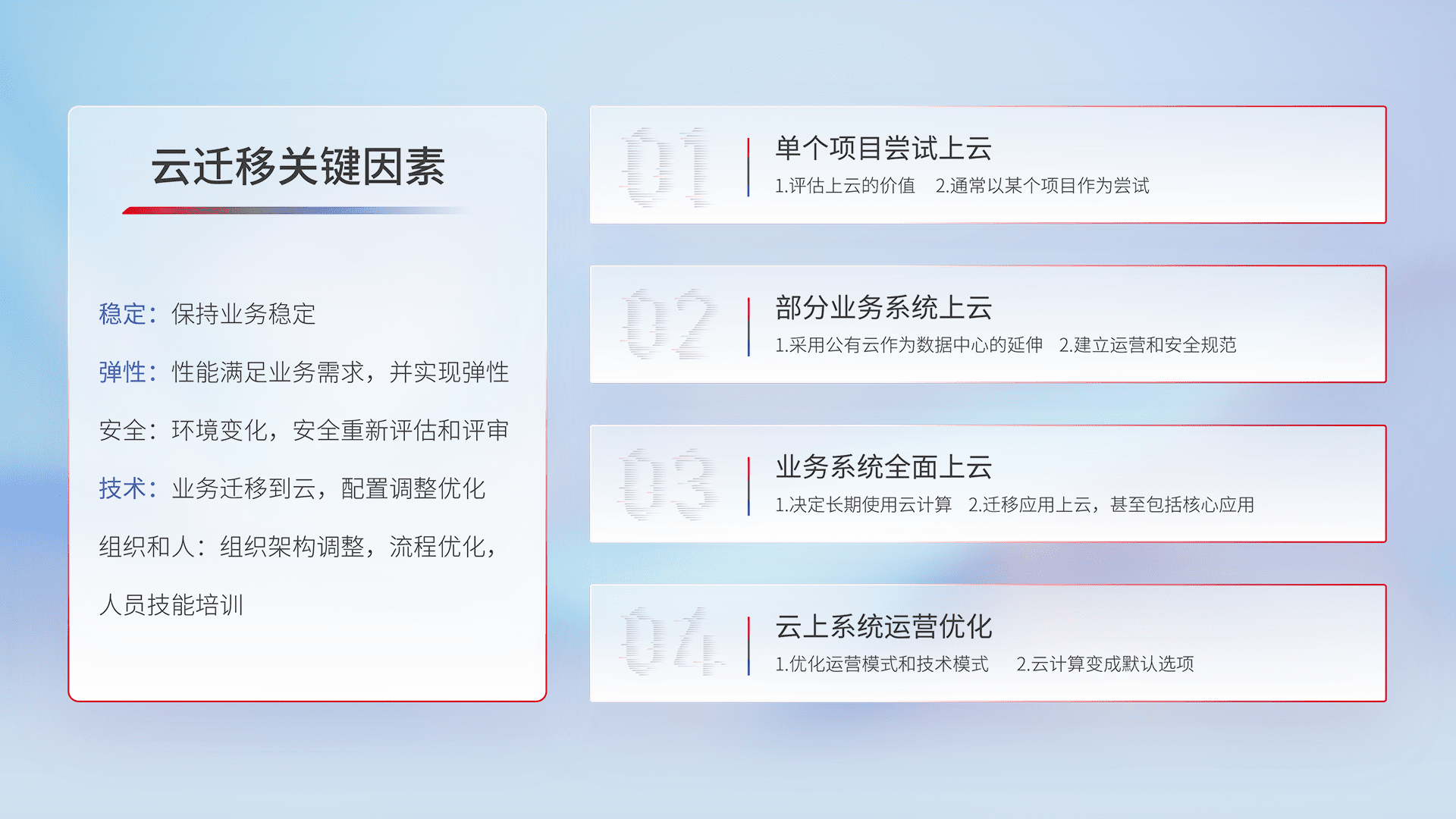结合实际业务,,,从规划设计、、、云平台选型、、、云原生改造、、、数据迁移、、、集成交付,,,迁移全过程为客户识别最佳上云路径,,,做好风险识别管理,,设计网络架构、、身份权限、、安全审计合规、、操作审计、、日志审计、、监控告警策略、、、、多站点容灾设计等,,对云上基础设施进行整体规划,,,提升IT治理水平,,,以满足弹性、、、、高可用、、、、高性能的需求。。
