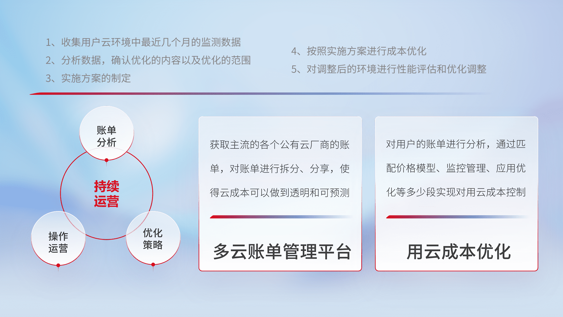 通过多云纳管,,,,以统一的资源数据模型把客户的云资源进行抽象和封装,,,,进而实现对多云资源的统一操作,,保障云资源管理的可靠性、、、稳定性与可用性。。。量身定制化运维内容,,,,配置、、、开发运维、、、补丁管理、、备份、、、监控、、、认证和访问管理、、审计和日常巡检等,,,保障在用云过程中的可靠度,,稳定度以及高可用率。。。
